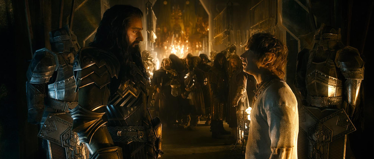 The situation worsens when the folks of the destroyed Lake-town, lead by Bard the Bowman (Luke Evans), head up the mountain seeking shelter and repayment for their ravaged homes. Elf-king Thranduil (Lee Pace) eventually arrives too, with an army of elf soldiers, intent on reclaiming a necklace of white gems from Thorin’s treasure. When Thorin refuses both Thranduil and the people of Lake-town entry into the mountain, they gather their forces at Dale, the base of the mountain, in order to attack, forcing Thorin to share his newfound riches. All the while, an old foe, the Pale Orc, Azog the Defiler (Manu Bennett), has gathered legions of Orc and Goblin soldiers who are secretly marching to the mountain with heinous plans of wiping out the collected armies of Middle-earth. Let’s not forget about Bilbo Baggins (Martin Freeman), the Hobbit burglar — still carrying that pesky ring in his pocket — caught in the middle of the quarrel, torn between his friendship with the dwarves and his survival instinct, covertly teaming up with Gandalf (Ian McKellen) as war breaks out at the base of the mountain.