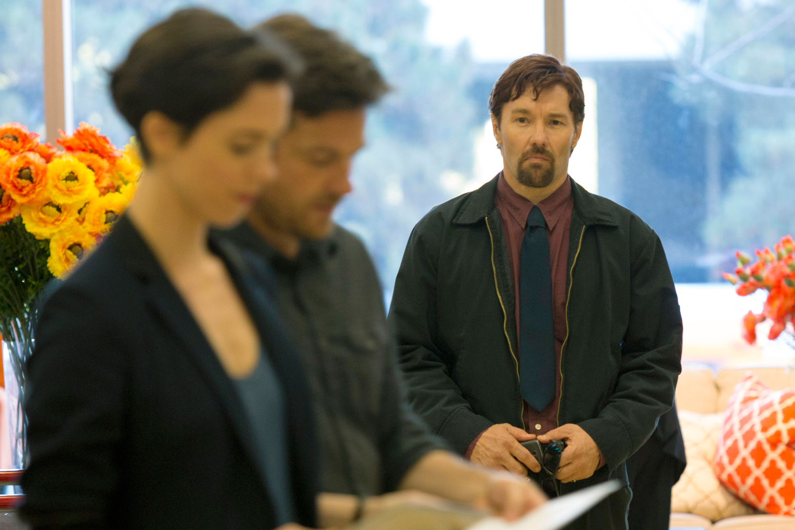Having just moved from Chicago to Los Angeles for a fresh start, Simon (Jason Bateman) and Robyn Callen (Rebecca Hall) appear to be a happily married well-to-do couple that are looking to start a family. Shifting into a uniquely designed home, the pair quickly slip into their daily routines; Simon commences a snazzy new job at a high-profile digital security firm whilst Robyn — following a breakdown in Chicago tied to a miscarriage — starts working from home as she strives to get back into her passion of freelance designing. While out buying supplies for their new home, the couple run into Gordon ‘Gordo’ Moseley (Joel Edgerton), Simon’s old classmate; a lonely guy who seems desperate to reconnect. After pushing himself into the pair’s life with gifts and daily visits — usually when Simon is at work and his wife is alone at home — Robyn warms to Gordo and considers him to be a sensitive lost soul, who has nothing but good intentions for the pair. Simon on the other hand becomes frustrated by Gordo’s omnipresence and refuses to rekindle any sort of friendship with this face from the past. As more extravagant gifts pop up — complete with notes finishing in smiley faces — Simon seeks to ‘politely’ put an end to this ‘asymmetric relationship’ after a strange evening at Gordo’s surprisingly posh two-storey house. When the couple’s dog mysteriously disappears — a wink to Fatal Attraction (1987) perhaps? — Simon assumes that Gordo hasn’t taken too well to his reprimand and immediately suspects the ‘weirdo’ as the culprit, urging Robyn to forget about him and simply move on. But after receiving one final note from Gordo, which addresses Simon by stating that he was willing to ‘let bygones be bygones,’ Robyn begins her own investigation into the mysterious man from her husband’s former life, uncovering Simon’s dark, questionable past in the process.