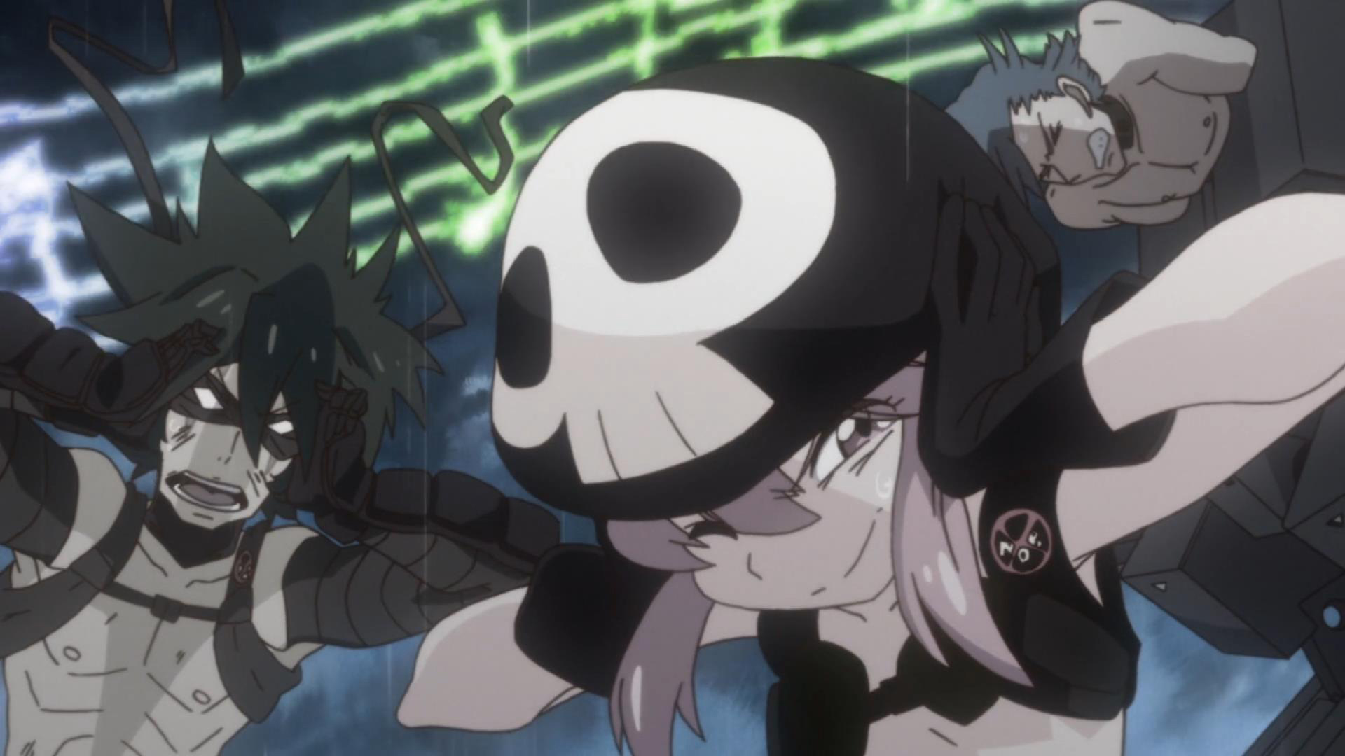 So, while Kill la Kill’s leads are certainly provocative and compelling — evoking interest in their weightiness and conviction — there are accompanied by an abundance of equally stirring second tier personalities, all embedding so much depth and individualism to their respective roles; the members of Elite Four are solid stand-outs within this category. This unstoppable ‘cream of the crop’ party is made up of the following adept individuals, four teenagers who excel within their particular fields; first up, there’s the ‘always serious,’ enormously towering, muscular Ira Gamagōri, who, holding the Disciplinary Committee Chair, works as Satsuki’s enforcer and right-hand man, and bears no tolerance for foolishness or rule-breaking, and is more often than not, seen shouting at the top of his lungs whenever he’s opposed; then there’s the overly confident and self-assured hotshot, dark-green haired Uzu Sanageyama, and, as Athletic Committee Chairman, he deals with recreational sports such as tennis and boxing; which leads us to the Non-Athletic Committee Chair-‘person,’ with the petite, pink-haired dreamboat, Nonon Jakuzure, regulating non-physical activities such as gardening and musical plays — sassy and tantalizing, this small-busted, medium hipped doll (who’s almost always seen wearing a skull-marked hat) is undeniably the most arousing member of this gilt-edged task force; and, rounding up the unrivaled foursome, is the Information and Strategy Committee Chairman, Hōka Inumuta — with his teal-ish hairdo and collar-neck jacket (which, at the neckline, opens whenever he speaks), this sarcastic hacker analyst is in charge of strategics and research, though it’s rather apparent that Inumuta is possibly the most physically restrained student in the assemblage.