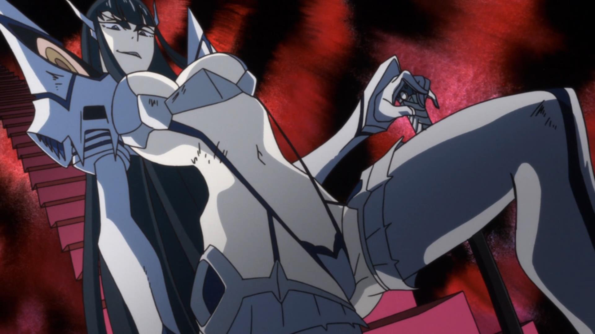 Realizing that her Rending Scissors — the scissor sword — is able to cut and slice through Goku Uniforms, Ryūko goes head-to-head with Satsuki, in an attempt to get answers regarding her father’s murderer, suspecting that tall, slim, long-dark-haired beauty knows more than what she’s letting on. Lunging at the tyrannical President, only to be beaten to the ground by the school’s Boxing Club Captain, Takaharu Fukuroda — who uses the power of his two-star Goku Uniform — a shocked and demoralized Ryūko flees the scene in utter defeat. Beaten and humiliated, Ryūko revisits her father’s burnt down home — which is, um, pretty much his grave — where she stumbles upon Senketsu, a sentient sailor uniform known as a Kamui — articles of clothing made up entirely of Life Fibers. With the ability to transform into an extremely powerful and resilient suit of armor, Senketsu, gives the ‘wearer,’ who in this case is Ryūko, super-strength, transforming her into a formidable fighting machine — a slightly over-powered one at that — however, in order for this metamorphosis to occur, Senketsu needs to feed on the user’s, well Ryūko’s, blood; an allegory for female deflowering perhaps?