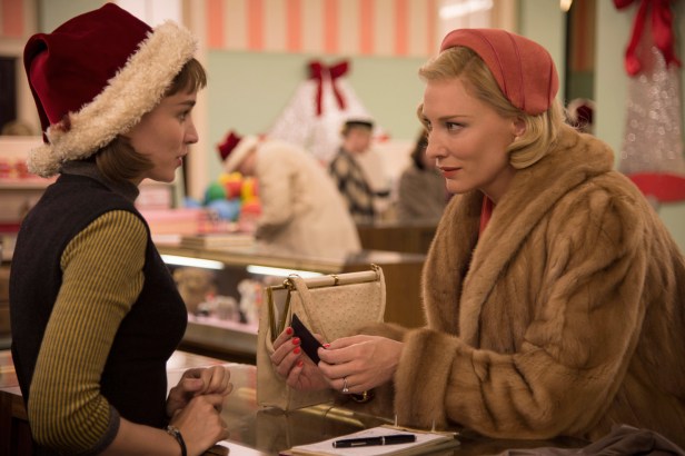 Set in New York during the 1950s, Carol follows the forbidden romance between a well-to-do suburban housewife and devoted mother, Carol Aird (Cate Blanchett), and a younger department store clerk and aspiring photographer Therese Belivet (Rooney Mara). The pair meet (and are immediately drawn to one another) after Carol enters a Manhattan department store in search of a Christmas present for her daughter Rindy (Sadie Heim), spotting Therese working behind the counter as a salesgirl. Carol is in search of a particular doll, which happens to have sold out, so Therese recommends a train set, and voilà — it’s love at choo choo! Anyway, Carol purchases the train set (which is a little odd seeing as her daughter wanted a doll for Christmas but is getting something entirely different instead), and leaves her expensive gloves at the counter. After some oohing and ahhing, Therese mails the mittens back to Carol, and as a thank-you, gets invited over to Carol’s trendy New Jersey home where she witnesses Carol and her husband Harge (Kyle Chandler) bicker with one another, which deepens the women’s connection.