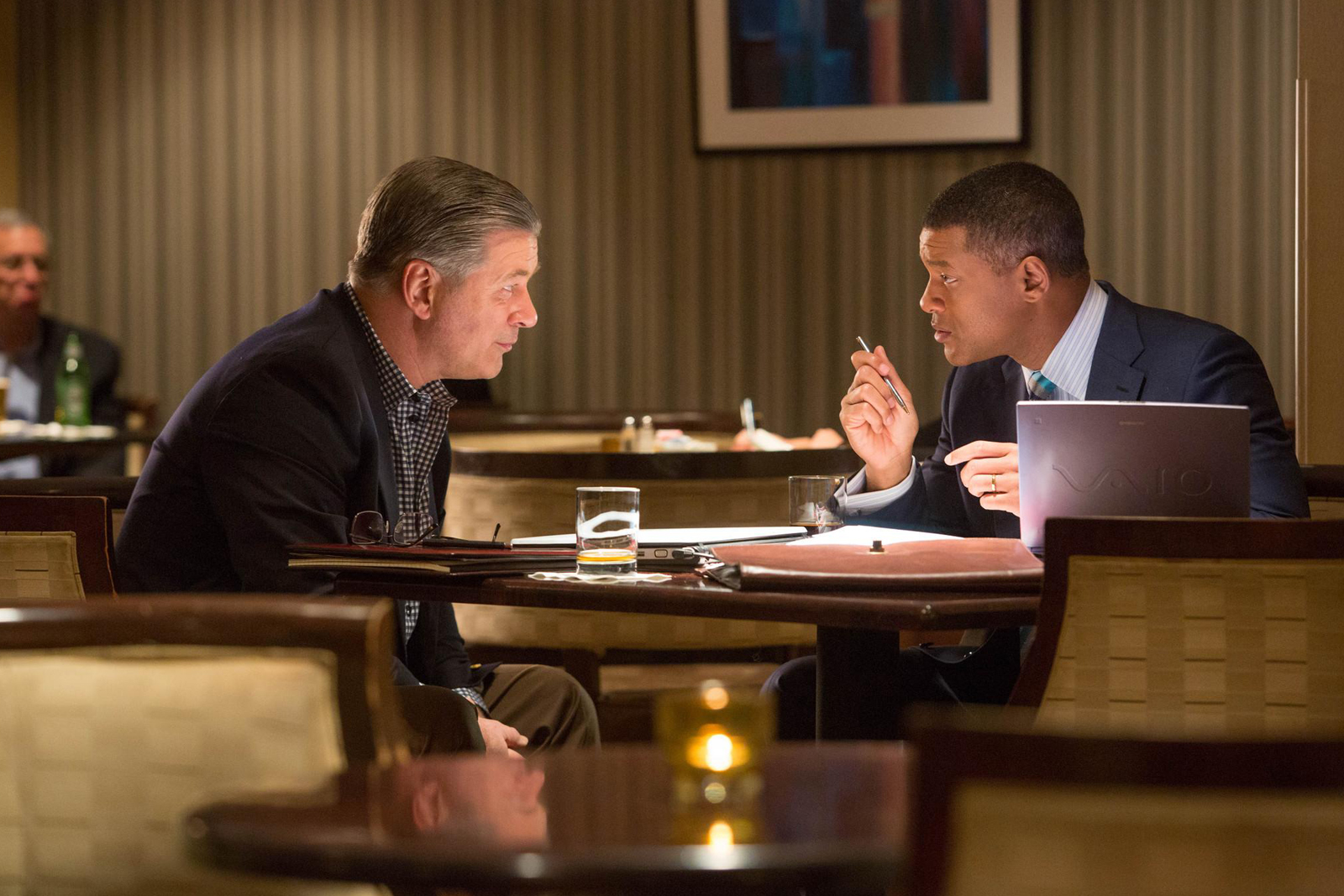 With Smith working as the film’s quarterback, he’s properly aided by competent and able support, even if these players are fairly conventional in a film of this type. First up on the peripheral pitch, Alec Baldwin, The Departed (2006), brings his A-game as former Pittsburgh Steelers’ team physician, now head neurosurgeon for the NFPA (National Football League Players Association) Dr. Julian Bailes, a profoundly conflicted guy who very quickly becomes a key ally in Dr. Omalu’s playoff; Baldwin vigilantly balancing Dr. Bailes’ torn allegiance — one that borders between his love of football and the unsettling proof evident in Dr. Omalu’s inquest.