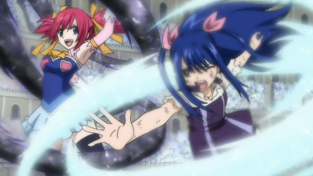Despite the onslaught of wild and wacky casters clashing on screen, the real charm here is watching Fairy Tail work together as a team (standing by one another through prosperity and hardship), giving it their all even when the chips are down, the odds stacked clearly against them. We bear witness to (first hand) the strong camaraderie and kinship between these guildmates, along with their badass magical abilities, strength, resilience and cunning. Fairy Tail’s one heck of a dynamic guild, each member worth their weight in gold. Through mutual respect and trust — and some fun banter to boot — Fairy Tail prove that nothing is impossible, establishing themselves as a formidable force that’s not to be reckoned with; steadfast, courageous, uncompromising and (above all) hilarious, everyone will be rooting for Fairy Tail’s eventual triumph. The Games’ first one-versus-one fight, in which Lucy is matched-up against Ravel Tail’s busty and sadistic Flare Corona (Flare’s arsenal being her crimson locks) certainly demonstrates Fairy Tail’s unmatched resolve; as is Natsu’s standoff with Jiemma, who humiliates Yukino in front of her entire guild, Natsu sticking up for a fellow mage’s injustice while teaching the guys at Sabertooth a thing or two about compassion and candor (the way things are done at Fairy Tail) — his actions a testament to the guild’s kindness and mercy. Both are episodes that’ll surely stick long after the season’s end.