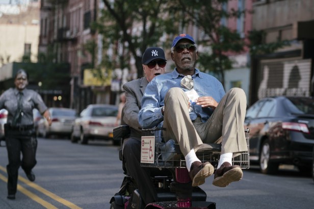 The film opens when Joe Harding (Michael Caine’s seventy-something character) shuffles into the merciless Williamsburg Savings Bank to speak to its insensitive manager, Chuck Lofton (a cartoonish Josh Pais), about a foreclosure notice that was delivered to his home. Low and behold, Joe finds himself in the midst of a bank robbery, where three ‘rather pleasant’ masked goons get away with 1.6 million dollars, right in front of everyone’s noses. Joe’s financial situation worsens when his former place of employment, a Brooklyn-based steel company, shuts down, the higher ups deciding to outsource to Vietnam. With the same bank (Williamsburg) freezing its employee’s pensions, Joe and his best friends/ co-workers Willie (Morgan Freeman) and Albert (Alan Arkin) find themselves in a bit of a jam. See, Joe needs money if he wishes to continue supporting his recently divorced daughter, Rachel (Maria Dizzia), and granddaughter, Brooklyn (Joey King), who both live with him. Meanwhile, Willie needs a new kidney, with his financial situation making it next-to-impossible to visit his family (who reside in another state), while his roommate Albert, a struggling saxophonist, is trying to make ends meet by teaching inept students how to play instruments — this scenario bringing about one of the flick’s funniest moments.