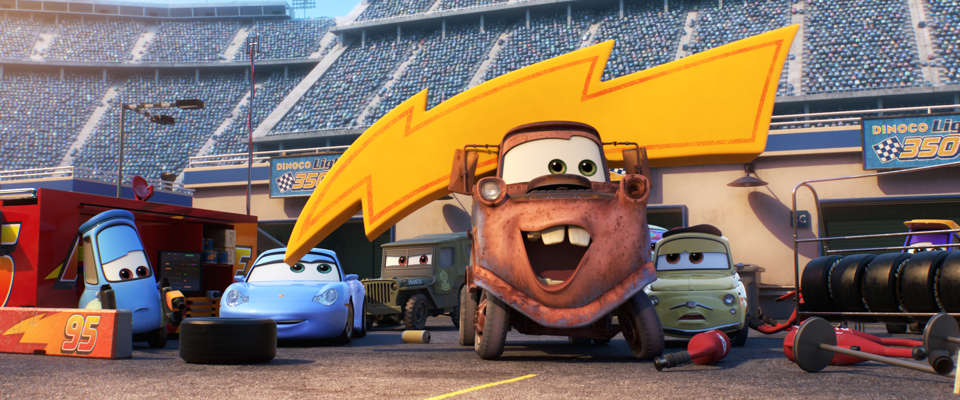 As per usual, the animation is dynamite, which is exactly what patrons have come to expect from Pixar, Cars 3 boasting some of the most photo-realistic computer-rendered imagery to date. Holding vast, colorful crowds and neon-tinted racers, the Daytona-inspired seaside speedway — home to the Florida 500 — is real visual treat, this glassy, forward-looking arena a standout set piece. Moreover, the blazin’ race scenes are wild and visceral, with McQueen’s stunningly photographed 24-second crash working as an emotional hook, audiences dropped right in the middle of this viciously disordered tumble. The film’s apex, however, is a crazy 8 demolition derby, which is unlike anything the franchise has ever showcased before. Held in the twilight hours of a country fair, surrounded by dense pine-tree woodlands, this mud-soaked ‘bump n grin’ is a blitzing, rambunctiously choreographed hoot.