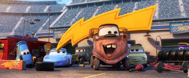 Cut to ‘four months later,’ the bruised and banged-up McQueen having spent some ‘time out’ for self-reflection, seeking solace back in his hometown of Radiator Springs, our broken hero trying to re-assess and re-evaluate his life. Inspired by the legacy of idol Doc Hudson, along with a pick-me-up from gal pal Sally (Bonnie Hunt), and some encouragement from trusty tow-truck bud’ Mater (Larry the Cable Guy reprising his role), the now primer-coated McQueen decides to get back on his tyres, hoping to make a huge return to the world of racing. It’s soon revealed that during his forced ‘leave,’ Rusty and Dusty (voiced by Tom and Ray Magliozzi) — owners of Lightning’s Rust-eze brand — had sold their company to a booming business-car named Sterling (Nathan Fillion), who, as luck would have it, just so happens to be a huge admirer of the lightening-fast McQueen. Knowing a thing or two about the sport, the oily Sterling — having transformed the center into an elite, high-tech training garage — decides to cut a deal with the washed-up McQueen, the tycoon hoping to sell loads of #95-themed merchandise, thus profiting on his high-flying reputation.