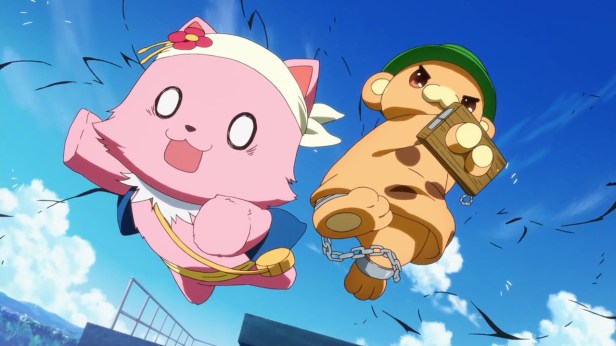 Aiding the muffling Moffle are two other Maple Land ‘artists,’ who (no surprises here) are equally as amusing; we have short-tempered sniper-trained violinist Macaron, (who knows a thing or two about explosives), this music fairy’s outer shell being that of a cutesy sheep; and his debaucherous partner in crime, the flower fairy Tiramie, a pink-and-fluffy kitty-cat who, despite his kawaii appearance, possesses the personality of a thirty-something horndog (whenever the kiddies aren’t around, of course), his lewd and lustful shenanigans supplying oodles of laughs. Needless to say, this bantering threesome is a downright hoot, their dysfunctional dynamic, ridiculous scheming and comical antics oh-so entertaining! Interestingly, each of these fairies has been given their very own sentence suffix, which is added to the end of most of their dialogue — it’s playful subtitles, such as these, that make Amagi such a joy to watch.