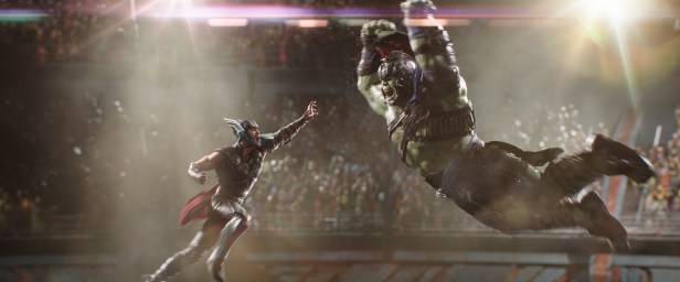 If you’ve seen any of Ragnarok’s marketing, you’ll know that Thor eventually finds himself without his magical hammer (Mjöllnir), Hela making short work of ‘Goldilocks’ and ‘Reindeer Games’ while traversing through the multicolored Bifrost beam. Running her hands through her silky black hair and revealing her antler-esque headpiece, Hela lays waste to all of Asgard’s armies, the catsuit-clad vileness seizing the Asgardian throne. Now, with her enemies eliminated, the ruthless Hela sets out to usher in a new era of cold callousness for the Nine Realms and the universe at large. Thor, in the meantime, finds himself prisoner on the retro-heavy Sakaar, a distant junkyard of a planet that thrives on indulgence and chaos. Ruled by a gilded dandy known as the Grandmaster (Jeff Goldblum at his Goldblum-y best), Sakaar also happens to be the home of a cosmic gladiatorial contest, Thor forced to defeat the arena’s hulking green champion if he wishes to escape the trash heap and return to Asgard to try and liberate its people.