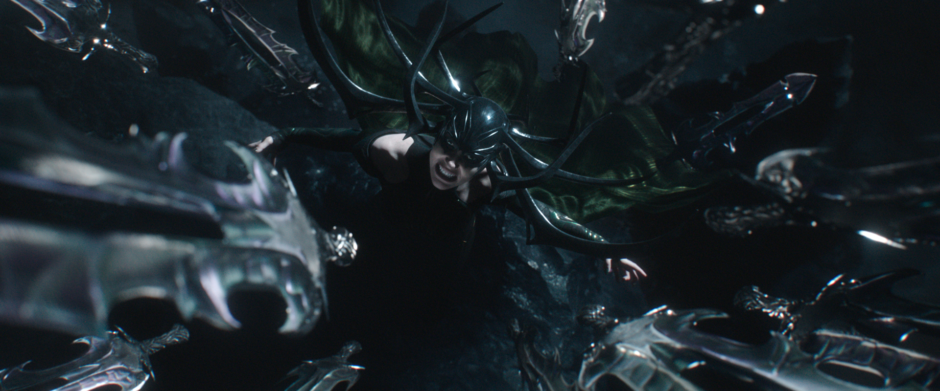 After a bit of delightfully silly theater (with a few surprising cameos), Odinson exposes his mischievous shape-shifting brother, Loki (Tom Hiddleston), who’d been impersonating their father, Odin (Anthony Hopkins), after dumping him on Earth. Missing, the pair put their sibling rivalry aside to track Odin down, Doctor Strange (Benedict Cumberbatch in an unnecessary yet amusing bit part) popping in to help ‘em out. The core story, however, kicks-off with the arrival of Hela, the Goddess of Death (Cate Blanchett) — and the brothers’ long-lost sister — who returns to Asgard (after a period of exile) to seek vengeance on those who cast her out of the realm, along with its history books.