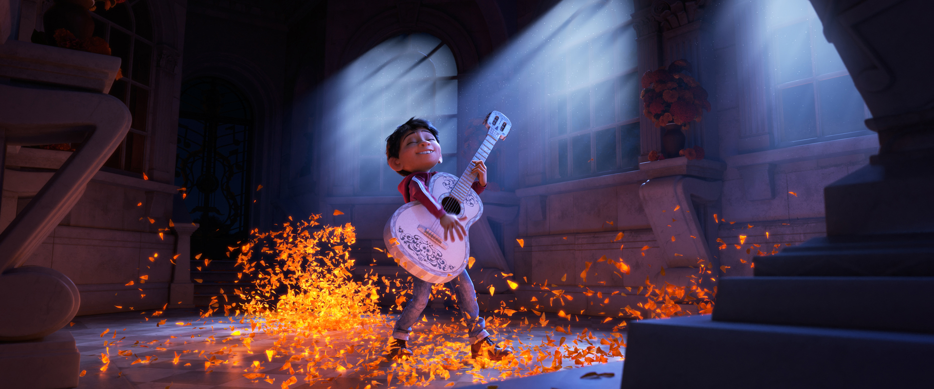 Some six years in the making — and Pixar’s first-ever musical — Coco opens with the iconic Disney tune played in mariachi style, this intro instantly setting the tone; if you look closely, you can see the film’s center-piece cemetery faintly in the background, just behind the classic Sleeping Beauty Castle. From there, viewers are transported to the fictional, music-loving Mexican village of Santa Cecilia (cleverly named after Saint Cecilia, the patroness of musicians), where we meet 12-year-old Miguel Rivera (Anthony Gonzalez), an aspiring muso who secretly dreams of becoming an accomplished performer, just like his hero, Ernesto de la Cruz (Benjamin Bratt), the most famous singer-songwriter-actor in the history of Mexico.
