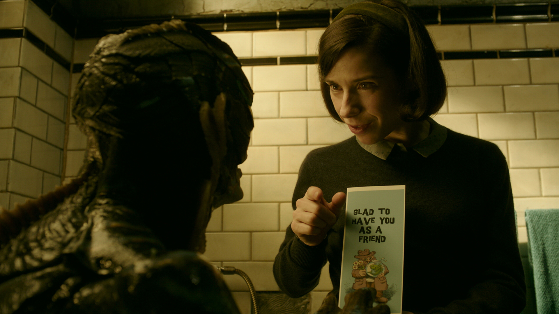 On one of their shifts, Elisa and Zelda find themselves scrubbing blood off the floor of a concrete-clad lab. Turns out that the company’s tough, sadistic head of security, Richard Strickland (Michael Shannon), lost a couple of fingers while wheeling a portable pressurized water tank into the facility. Tending to the workshop that houses the tank, Elisa takes a peak at what’s inside during one of her rounds. Imprisoned within the chamber she sees a mysterious amphibian creature (played under layers of makeup by Doug Jones) that’s dubbed the ‘Asset,’ the fish-man worshiped as a god where he was captured deep in the jungles of South America.