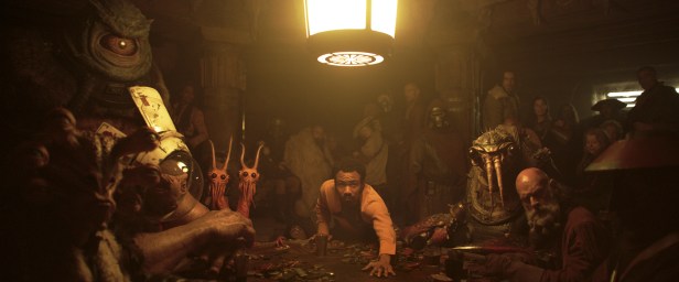 In addition, viewers are also treated to a handful of epic space opera beats — this is Star Wars, after all — the highlight being a dogfight between a pack of angry TIE fighters and the fastest hunk of junk in the galaxy (the Millennium Falcon), which takes place inside the perilous Maw Cluster (located near Kessel), an unstable and mostly unnavigable gathering of black holes surrounded by dangerous anomalies such as stellar debris and plasma clouds, this Outer Rim territory where Han eventually makes his iconic ‘Kessel Run’ in under 12 parsecs.