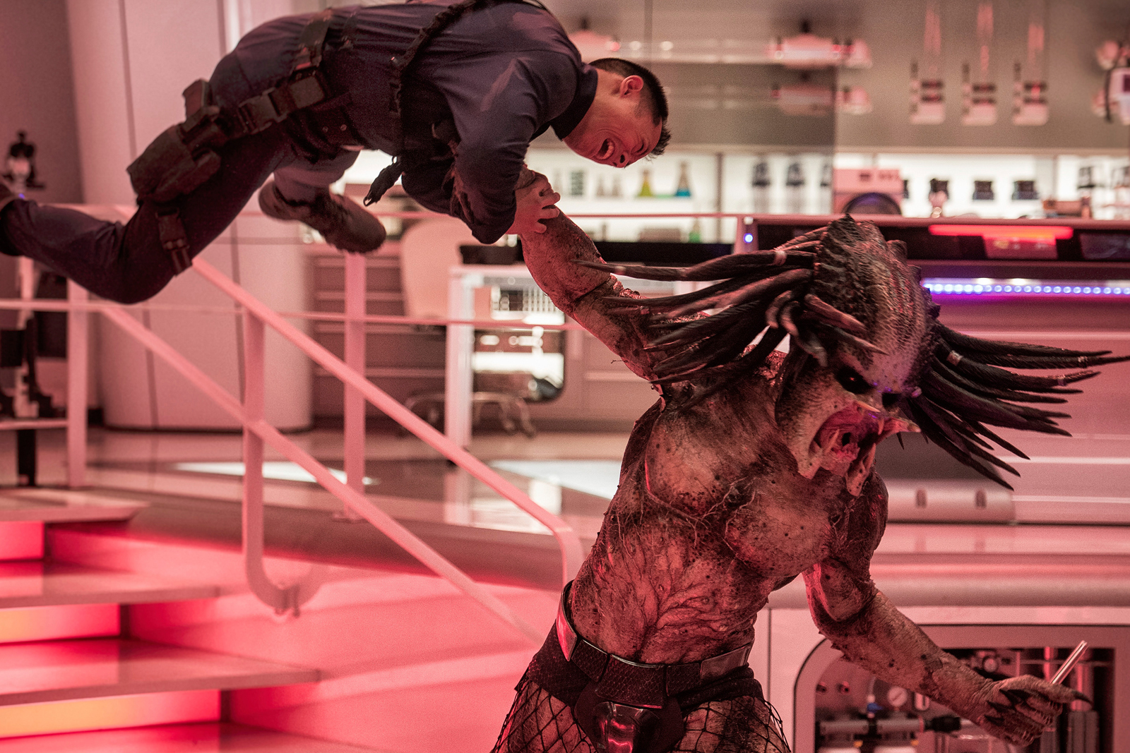 Anyhow, the narrative gets more convoluted when the U.S. government seizes Quinn and takes him in for questioning, to a top-secret lab that holds the Predator, who’s also been transported for testing, but is quickly woken by the device set off by Quinn’s son, the beast wreaking havoc and slaughtering everybody inside the facility, Munn’s feisty evolutionary biologist Dr. Casey Bracket slipping out unscathed.
