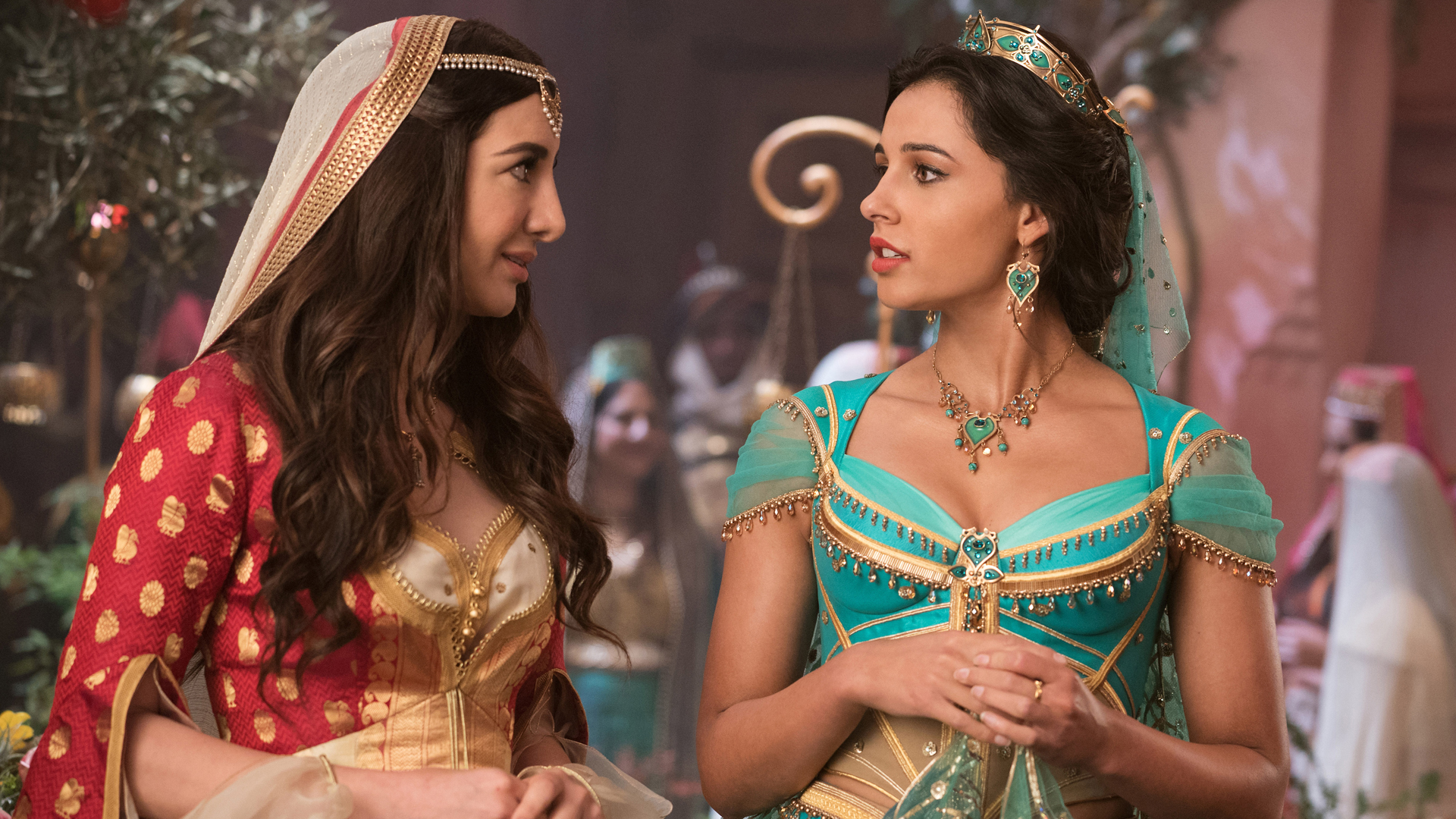 Whisked to ‘a faraway place where the caravan camels roam’ via Will Smith’s rendition of Alan Menken’s ‘Arabian Nights,’ Aladdin opens by dropping us into the Agrabah marketplace, the camera zig-zagging in and out of the busy, bustling bazaar before giving us glimpses of power-crazed Grand Vizier Jafar (Marwan Kenzari), who’s out at the tiger-shaped Cave of Wonders trying to get his hands on a magical lamp, and a dissatisfied-looking Princess Jasmine (Naomi Scott), confined to the palace walls. We’re then plopped back into the souk, where we’re introduced to street urchin Aladdin (Mena Massoud), the ‘diamond in the rough,’ and his mischievous digitally-rendered sidekick, capuchin monkey Abu. From there it’s ‘one jump ahead of the breadline, one swing ahead of the sword,’ as our cunning, street-smart street-rat outwits a swarm of palace guards, sweeping a disguised Jasmine off her feet, Aladdin coming to her aide by stopping her from having to surrender her mother’s prized bracelet after she’s caught ‘stealing’ some bread to feed a couple of beggars.