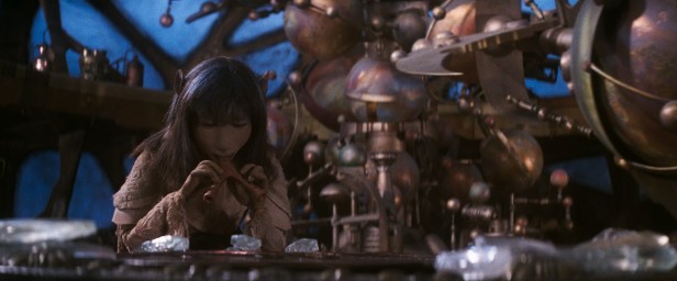 But, as the film stands, that’s all kind of window dressing. The Dark Crystal’s biggest issue is that its hero, Jen, isn’t very interesting, and so neither is his quest, for all that it is drenched in mythic symbolism. Henson gives us a pacifist hero but neglects to give him other things to overcome, or skills with which to accomplish his tasks other than the martial. He does have the odd moment of self-doubt and his ability to play his little bifurcated pipe comes in handy, but that’s about it. Kira, a kind of self-possessed wood nymph who’s accompanied by a little ball of fur and teeth called Fizzgig, fares much better in terms of characterization, even though she’s relegated to a secondary role (the drive to reconcile binaries falls short of gender parity, it seems).