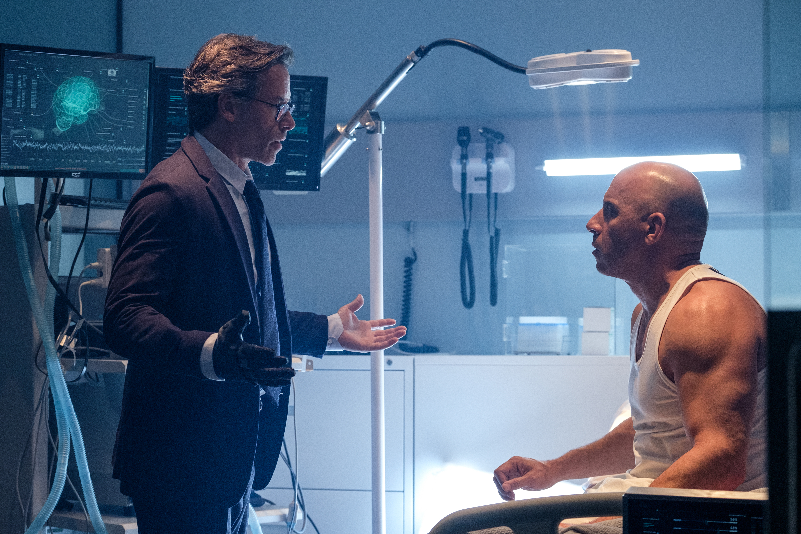 Vin plays Marine Ray Garrison, who is resurrected using nanotechnology after he and his wife, Gina (Talulah Riley), are assassinated as payback for the results of some of his military heroism. His scientific savior, Dr. Emil Harting (Guy Pearce), has made a project of enhancing injured combat veterans — he’s already given military diver KT (Eiza González) a new respiratory system, and Navy SEAL Jimmy Dalton (Sam Heughan) bionic legs, while former sniper Tibbs (Alex Hernandez), blinded in the line of duty, now has a suite of cameras feeding data into his visual cortex. Ray, however, is the first dead guy they’ve brought back (there’s your Robocop), sans memory (hello, Wolverine) but with his bloodstream full of nanites that will heal almost any injury (hello again, Wolverine).