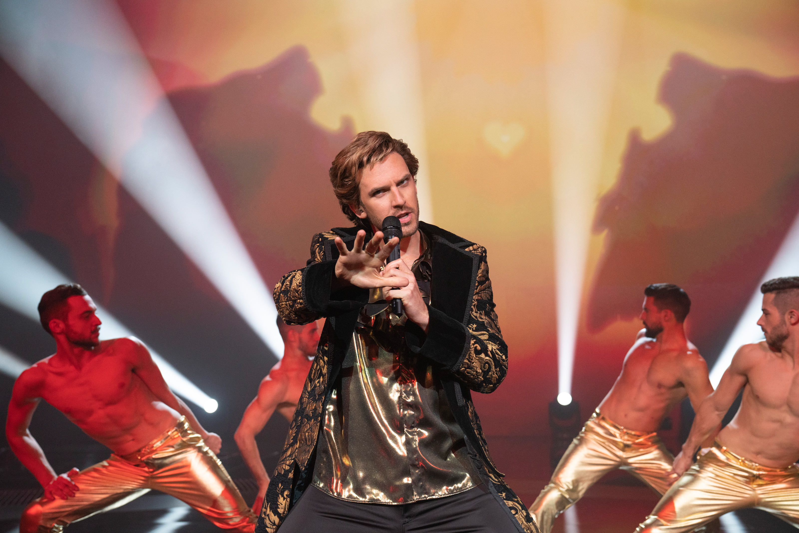 Then there’s Dan Stevens, Beauty and the Beast (2017), who steals the movie as sexed-up Russian pop star Alexander Lemtov, who’s poised to win the competition and threatens to tear Fire Saga apart — but, hey, he’s not actually a bad guy. Hogging the limelight with his flamboyant wardrobe, erotic accent, and seductive charm, Stevens makes the role his own, really getting into it and coming out as the most memorable character of the summer. When Alexander performs his signature hit ‘Lion of Love’ (actually sung by Erik Mjönes), Stevens feels like a natural-born star who belongs on the stage. At one point, Alexander invites Fire Saga to a soirée at his extravagant Gothic mansion before the finals, and we get a stack of cameos from past Eurovision icons including Anna Odobescu, who represented Moldova in 2019 with her track ‘Stay,’ Jessy Matador, who represented France in 2010 with the song ‘Allez Ola Olé,’ Austrian star Conchita Wurst, who rose to fame in 2014 after winning with the song ‘Rise Like A Phoenix,’ and Israeli singer Netta Barzilai, who won the contest in 2018 with her superbly strange track ‘Toy’ — seeing these guys perform together is a real treat for Eurovision fanatics. Also worthy of note is Melissanthi Mahut, In Transit (2014), who spices things up as Mita Xenaxis, a Greek contestant that maybe has a thing for Lars.