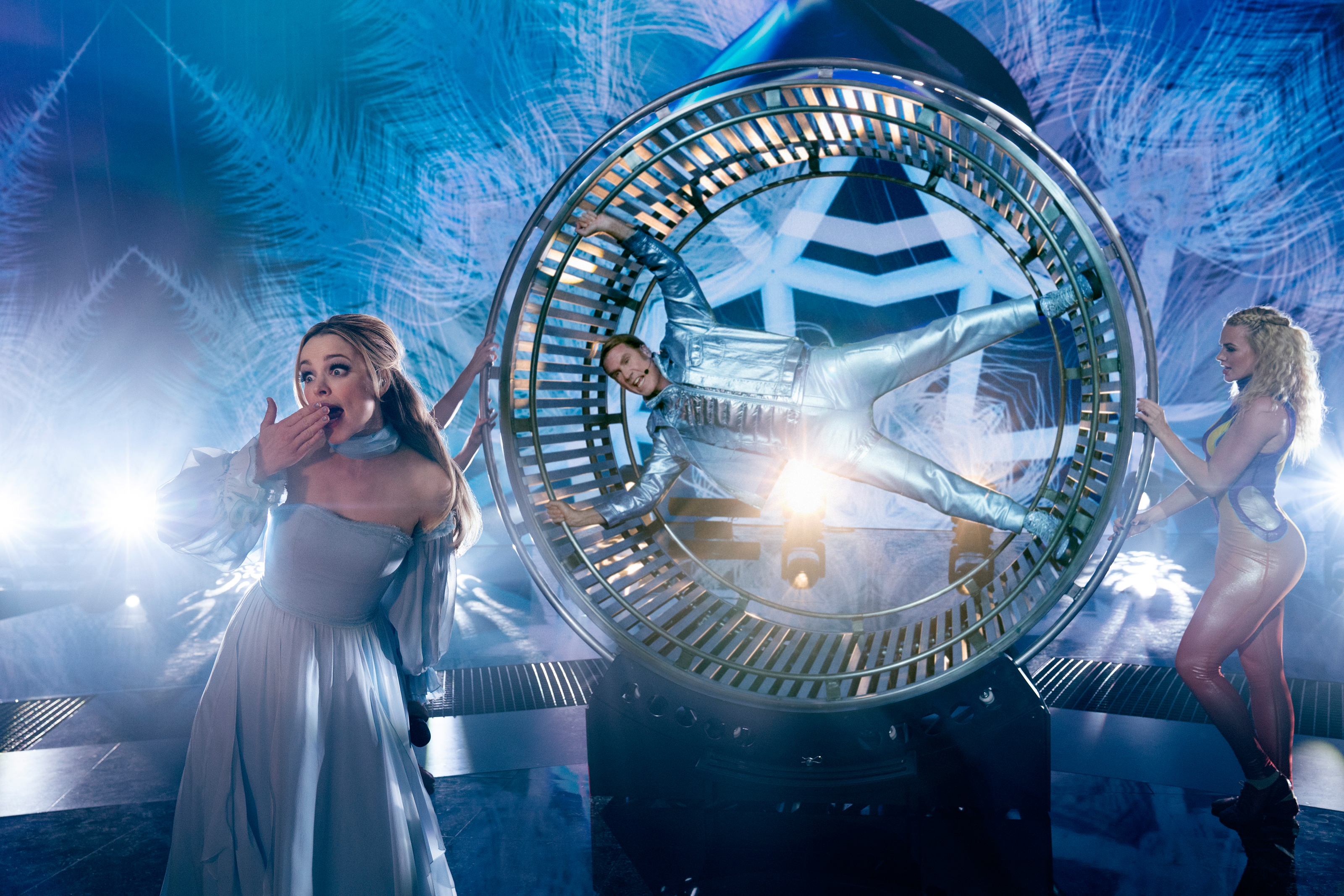 With that said, director David Dobkin, Wedding Crashers (2005), drags the film out a little (123 minutes is probably a smidge too long) with unnecessary odds and ends that make the length a bit hard to sustain — stuff about Lovato’s character appearing as a ghost to warn Lars that he’s in danger could’ve been cut. Given the vibrant energy of all things Eurovision, Dobkin also fails to inject the musical numbers with the type of oomph and pizzazz found in other similarly themed flicks such as Pitch Perfect (2012) or Mamma Mia! (2008), most coming off as somewhat flat. There’s a pretty amusing scene where Ferrell is performing on a giant hamster wheel, which malfunctions, catching onto Sigrit’s dress, then dragging her across the stage, but that’s probably the only moment that comes to mind in terms of musical highlights.