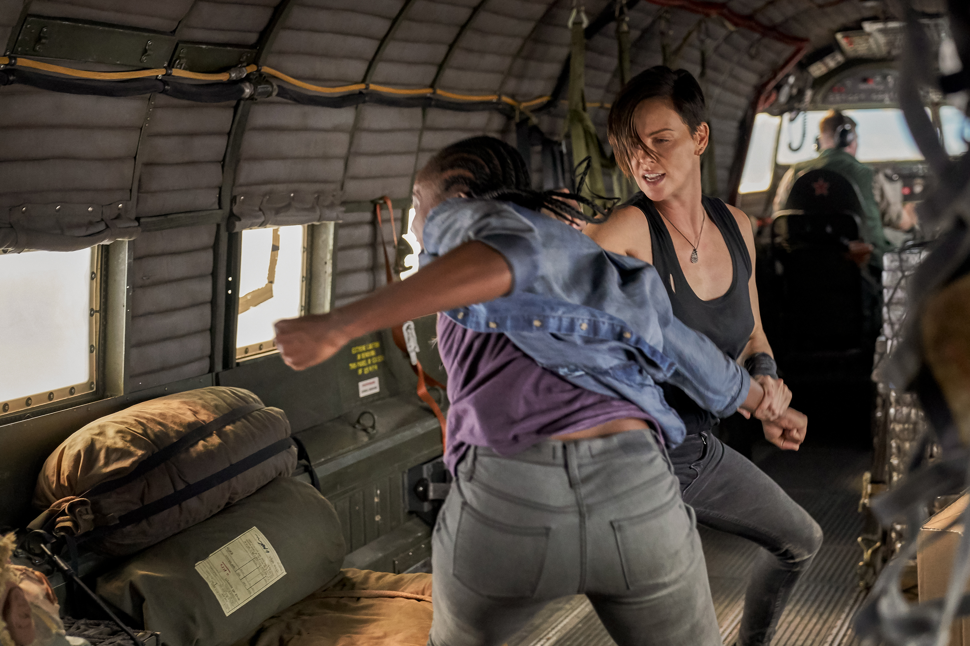 The mechanics of The Old Guard’s supernatural mythology is even murkier than Highlander’s and the plot — a biotech company wants to corral our heroes to milk them for medical advances — is surplus to requirements. What matters here is tone and mood, both exemplified by a simple shot early in the proceedings. Andy’s squad crouches in the belly of a helicopter as they’re ferried to the site of their latest mission, each tricked out in badass paramilitary gear. The camera tracks along the thigh of former Knight of the Crusades Nicky (Luca Marinelli), lingering on the hilt of a broadsword scabbarded there, contrasting it with the tactical shotgun in his hands. Boom! There’s your textural thesis right there.