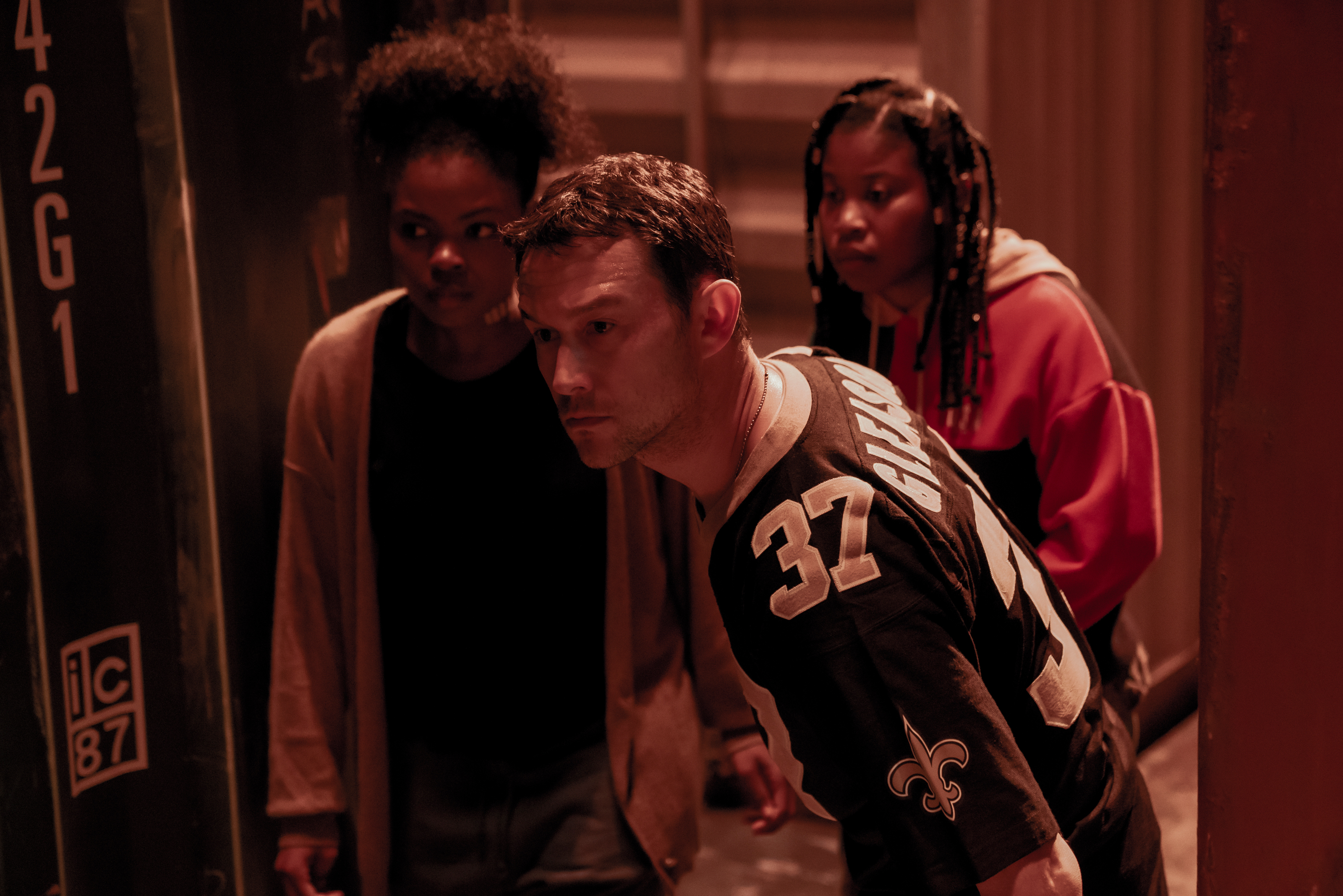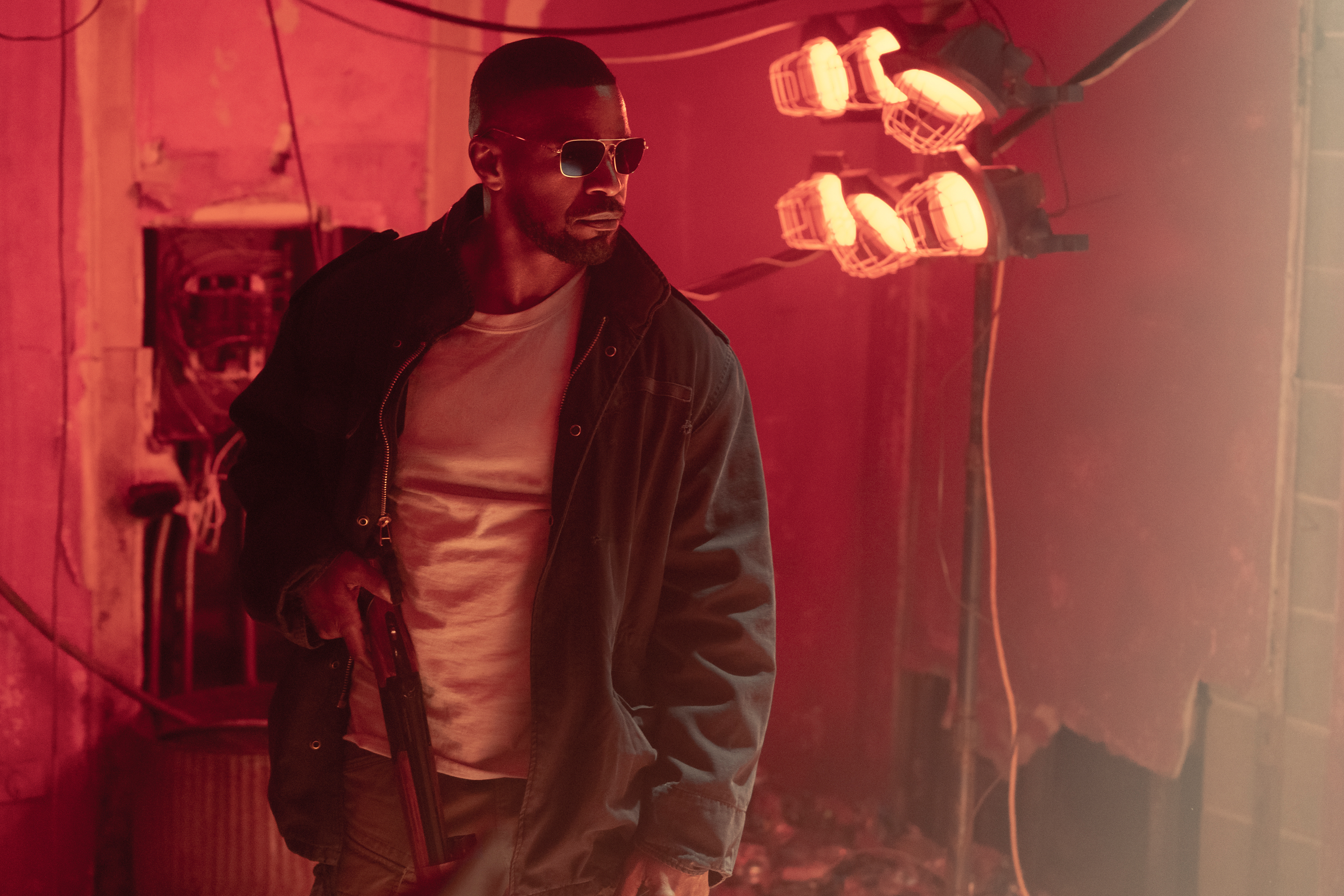 The Power pill, as it turns out, is sending ripples through the criminal world, toppling police precincts, and causing all sorts of chaos on the streets. Naturally, this is keeping ‘bullet-proof’ NOPD Officer Frank Shaver (Joseph Gordon-Levitt) busy, striving to locate both the drug’s source and its suppliers — let’s just say this local law enforcer operates a little outside of his badge. He’s partnered with a street-smart teen named Robin Reilly (Dominique Fishback), who deals the drug to make ends meet, trying to aid her ailing mother. Frank is one of her regular buyers and uses the drug to level the playing field while taking out bad guys. Things get complicated, however, when an ex-military man named Art, a.k.a. The Major (Jamie Foxx), hunts down Robin’s cousin and fellow Power dealer Newt (Colson Baker, known professionally as Machine Gun Kelly), resulting in a fierce pursuit that concludes with Baker’s man-on-fire (Newt possesses the ability to self-immolate) overdosing and blowing up a good chunk of his residential apartment block — this is a kick-ass scene and wholly sets the grim and violent tone for what’s in store.