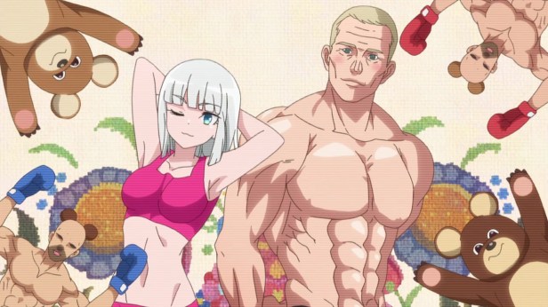 Other characters are equally as appealing, bringing with them different challenges and viewpoints on the wide world of working out. The athletic Ayaka comes from a family of boxers (her well-defined abs make her identifiable as the most disciplined of the gals), whereas history teacher Satomi Tachibana provides some spot-on observations on the awkwardness of running into students outside of school hours. And then there’s Machio, the well-informed, speedo-sporting trainer, who supplies much of the laughs with his absurd bro-science, ridiculous poses (Saido Chesto!), and comical physique — his shredded form is a complete contrast to his baby face. And, what school-centered anime would be complete without the transfer student; this time, it’s white-haired Russian darling Gina Boyd, whose competitiveness and general fascination with the Japanese culture (although, she’s always getting it confused with Chinese) infuses the proceedings with an extra dash of silliness.