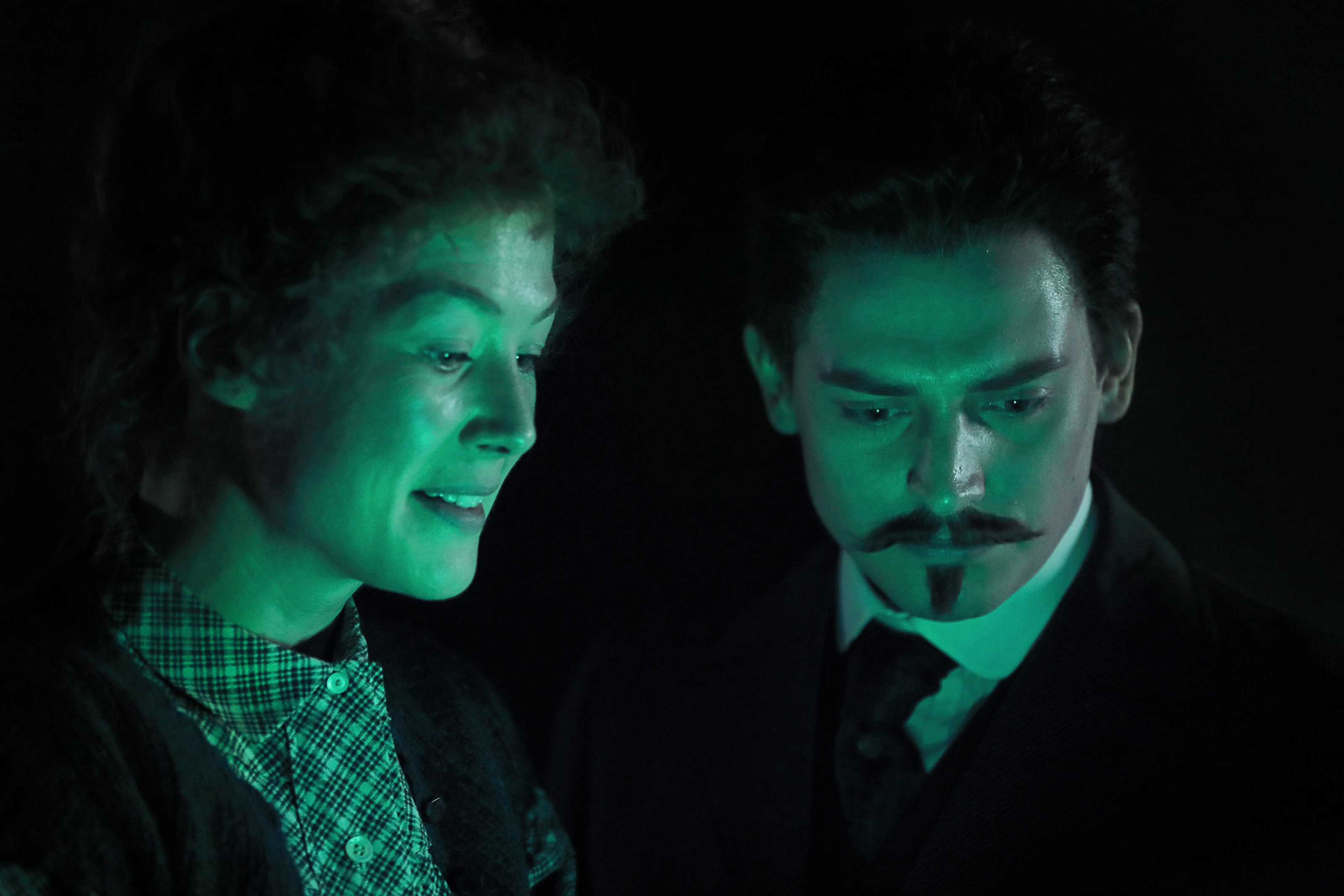 Rosamund Pike, Gone Girl (2014), is given the task of embodying Maria Sklodowska, the young science prodigy who fought the all-male University system to try to find lab space for her ground-breaking experiments, who would later become the lauded Mme Marie Curie. Although the film attempts to eschew a traditional narrative associated with many biographical features by combining elements that exist outside the narrative framework of Curie’s life, it ultimately adopts a linear structure that takes us through her life in a roughly chronological sequence. We first meet Marie in the moments leading up to her death by radiation-induced anemia, and we follow her progress as a scientist of great note; mostly through her relationship with the university that she worked at. Headed by Professor Lippmann (Simon Russell Beale), this relationship personifies her fight against an almost exclusively male system that resents her intrusion as both a woman and a foreigner, which is a key theme throughout the piece.