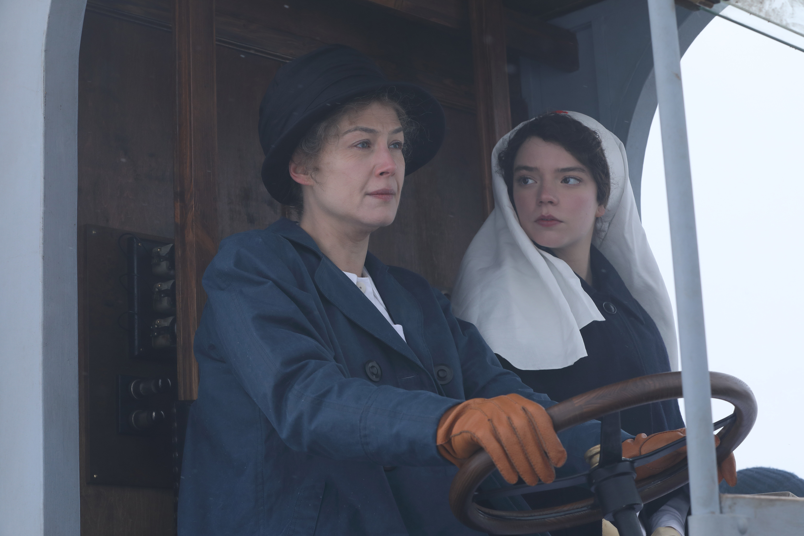 Rosamund Pike is a fit cast as Curie; she is an intelligent actor with the ability to balance an icy exterior with a deeply passionate core. However, as the film progresses, it becomes clear that the screenplay by Jack Thorne, Enola Holmes (2020), gives her little to do but to switch between two fairly constricted modes. Curie seems at times so distant that, textually, she characterizes herself as a bad mother, yet at other times her passion — especially for Pierre — causes the film to veer into romantic drama. Small flourishes, such as Marie sleeping with a bottle of radium, are there to remind the audience that she is a brilliant and driven scientist, but sadly it becomes a slight concessional token. It isn’t until much later in the film when her daughter Irène, played by Anya Taylor-Joy, The Witch (2015), is an adult and burgeoning scientist of note that we see Marie devoting herself with urgency to her inventions, in this case, a portable x-ray, on the battlefields of WWI France.