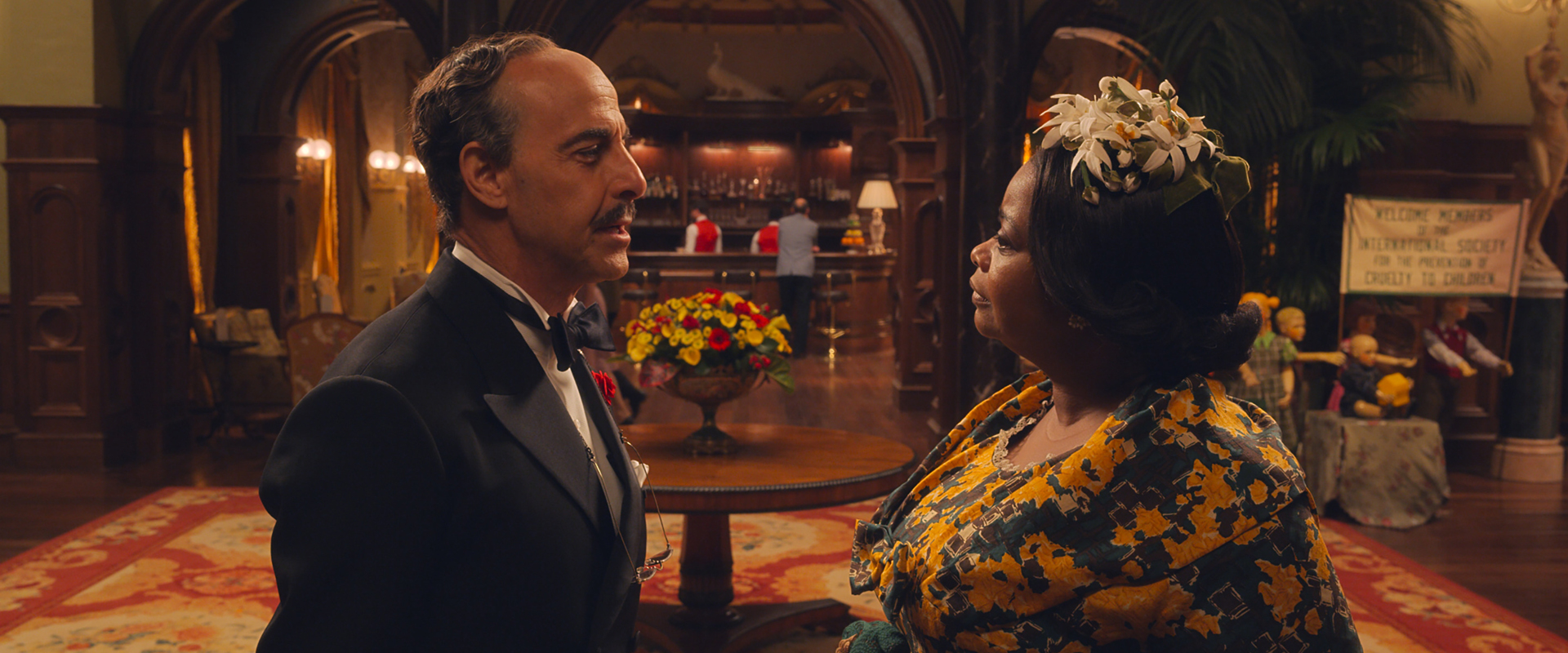 The performances are good, too, particularly that of the great Hathaway, who skirts a fine line between cartoonish and frightening. Octavia Spencer, Hidden Figures (2016), radiates maternal warmth, although she could probably do this kind of thing in her sleep. The always-reliable Stanley Tucci, The Hunger Games (2012), does a satisfactory job in his handful of scenes as hotel manager Mr. Stringer, a part that was played unforgettably by comedian Rowan Atkinson in the ’90 version. Newcomer Jahzir Bruno starts off somewhat stiff but grows into the part of Charlie, whilst both Chris Rock and Kristin Chenoweth (doing voice-work) sound just like themselves, their nonchalant work sometimes pulling me out of the action.