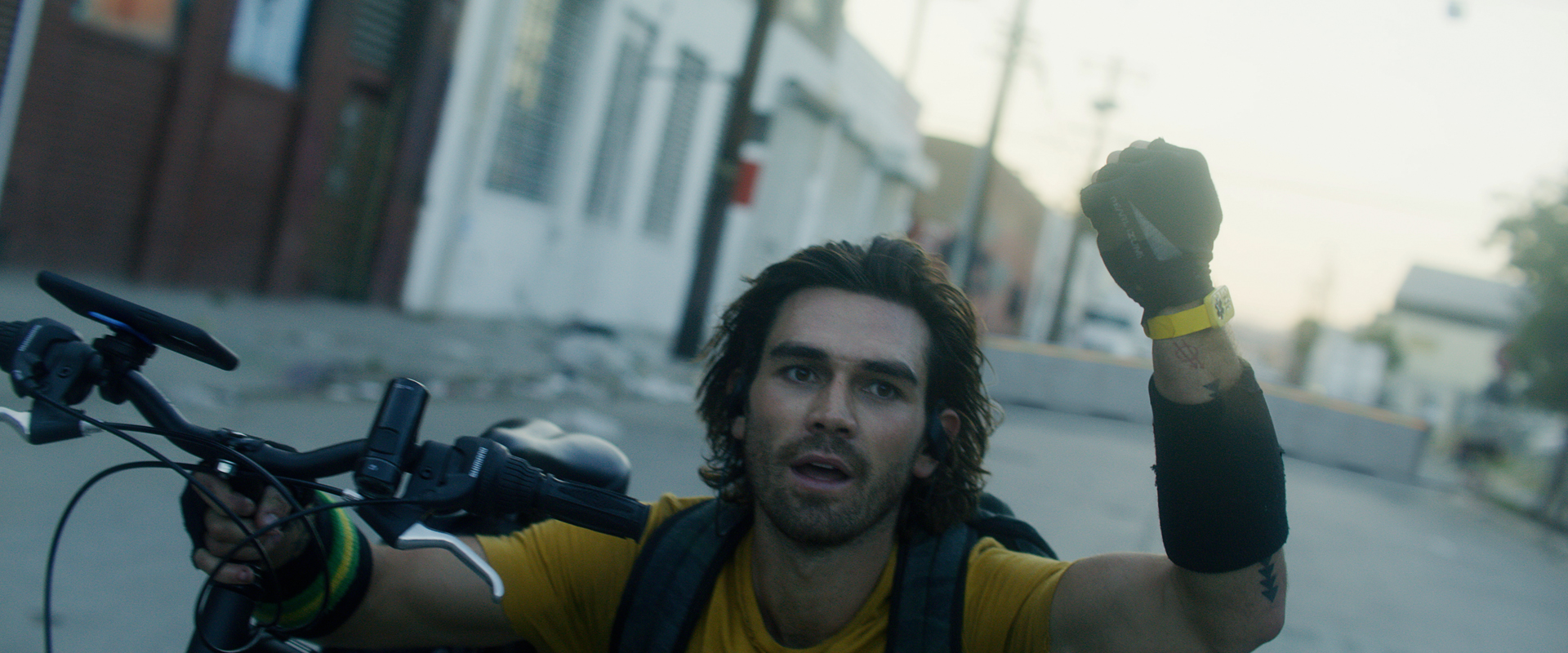Our hero is twentysomething Nico (played by the ever-watchable K.J. Apa), an immune motorbike courier that works for a guy named Lester (Craig Robinson), who seems to be running a one-person empire out of his workshop and keeps an eye on his riders by monitoring their movements via GPS. Nico fills most of his days riding around town, delivering packages to wealthy people, dropping stuff off in their ultraviolet mailboxes without making any physical contact. Nico also has a virtual girlfriend that he chats with through Facetime named Sara (a charming Sofia Carson), whom he’s never physically touched. He visits her daily and sits outside her apartment door, where she lives with her grandmother (Elpidia Carrillo).