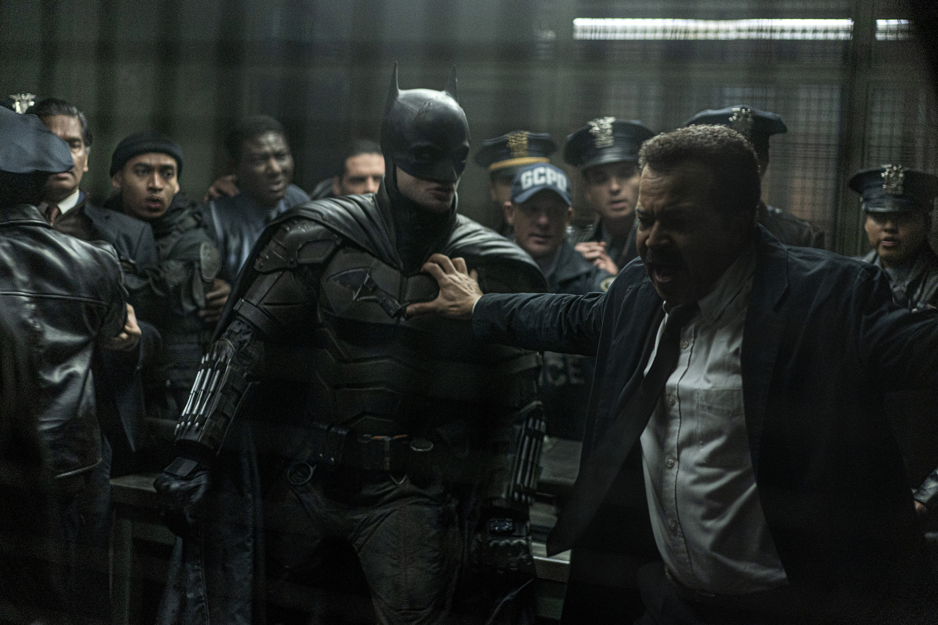 Aside from Pattinson, there are two other cast standouts. The first is Colin Farrell, who’s no stranger to playing bad guys in superhero flicks; remember 2003’s Daredevil? Farrell, who’s unrecognizable under multiple layers of facial prosthetics and a fat suit, is gleefully menacing as criminal kingpin Oswald Cobblepot (Oz), better known as The Penguin. Here, Oz is the proprietor of Gotham’s exclusive nightlife hotspot, The Iceberg Lounge, a meeting place for the city’s underworld. Colin’s maniacal performance manages to stand out even under the heavy face-scar prosthetics — it’s been reported that Farrell took inspiration for the Penguin from the ‘Fredo’ character in The Godfather (1972). Then there’s Jeffrey Wright, No Time to Die (2021), who’s truly commanding and brings gravitas to the role of Commissioner Gordon; he absolutely rocks!