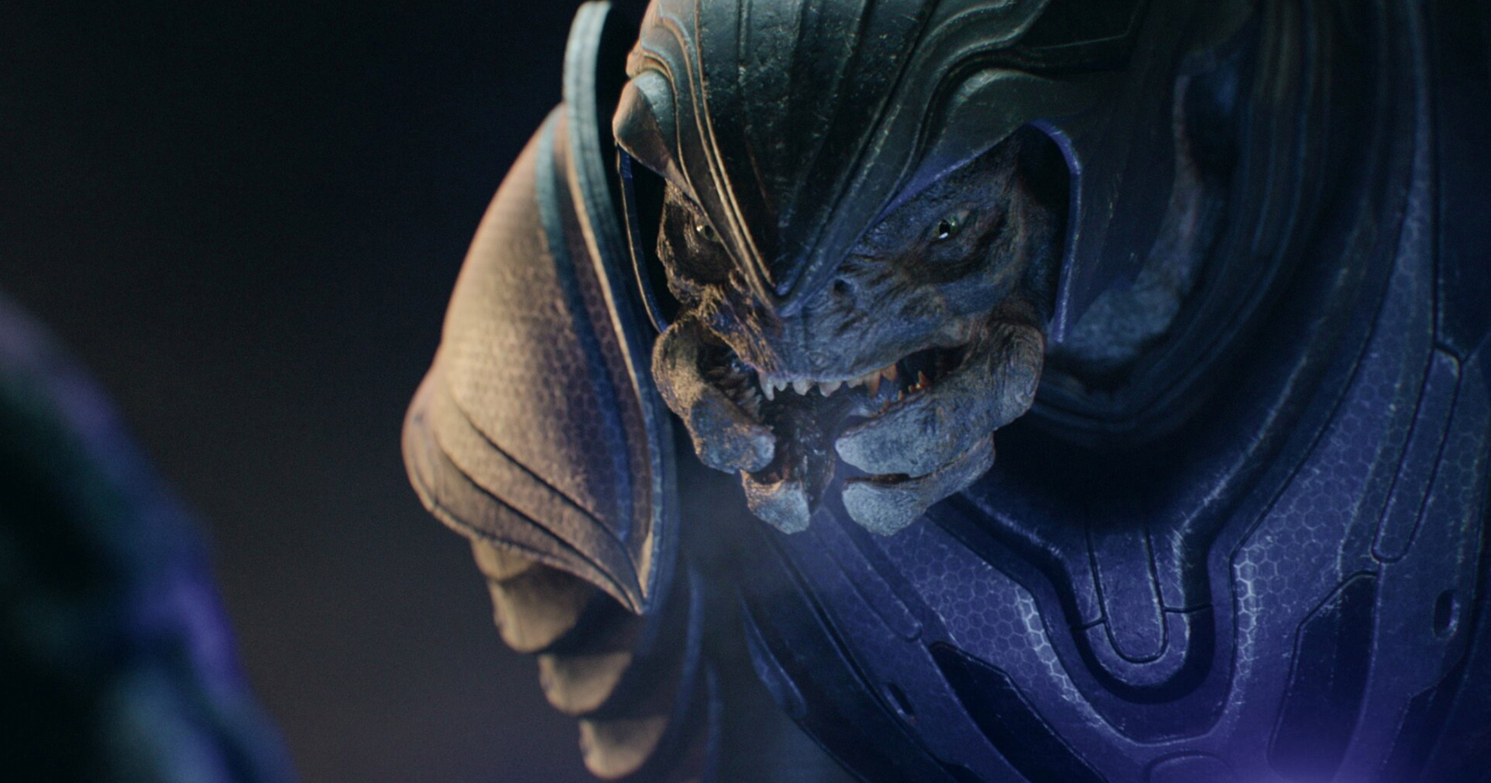 The visual aesthetic improves, too. At first sniff, for all that the powered armor and aliens are game-accurate, Halo feels like a weekend LARP; the costumes are too clean and generic, the outdoor locations on Madrigal too Earthly. We also, unfortunately, get a few point-of-view shots during combat to replicate the First-Person Shooter experience of the game, but they didn’t work in the Doom (2005) movie, and they don’t work here. But when we’re hanging out in the refreshingly physical interior sets of Soren’s outlaw colony, Halo somewhat ironically feels less artificial. At the same time, Woodbine’s easy charm offers a counterpoint to Schreiber’s stoic space commando and Ha’s traumatized survivor.