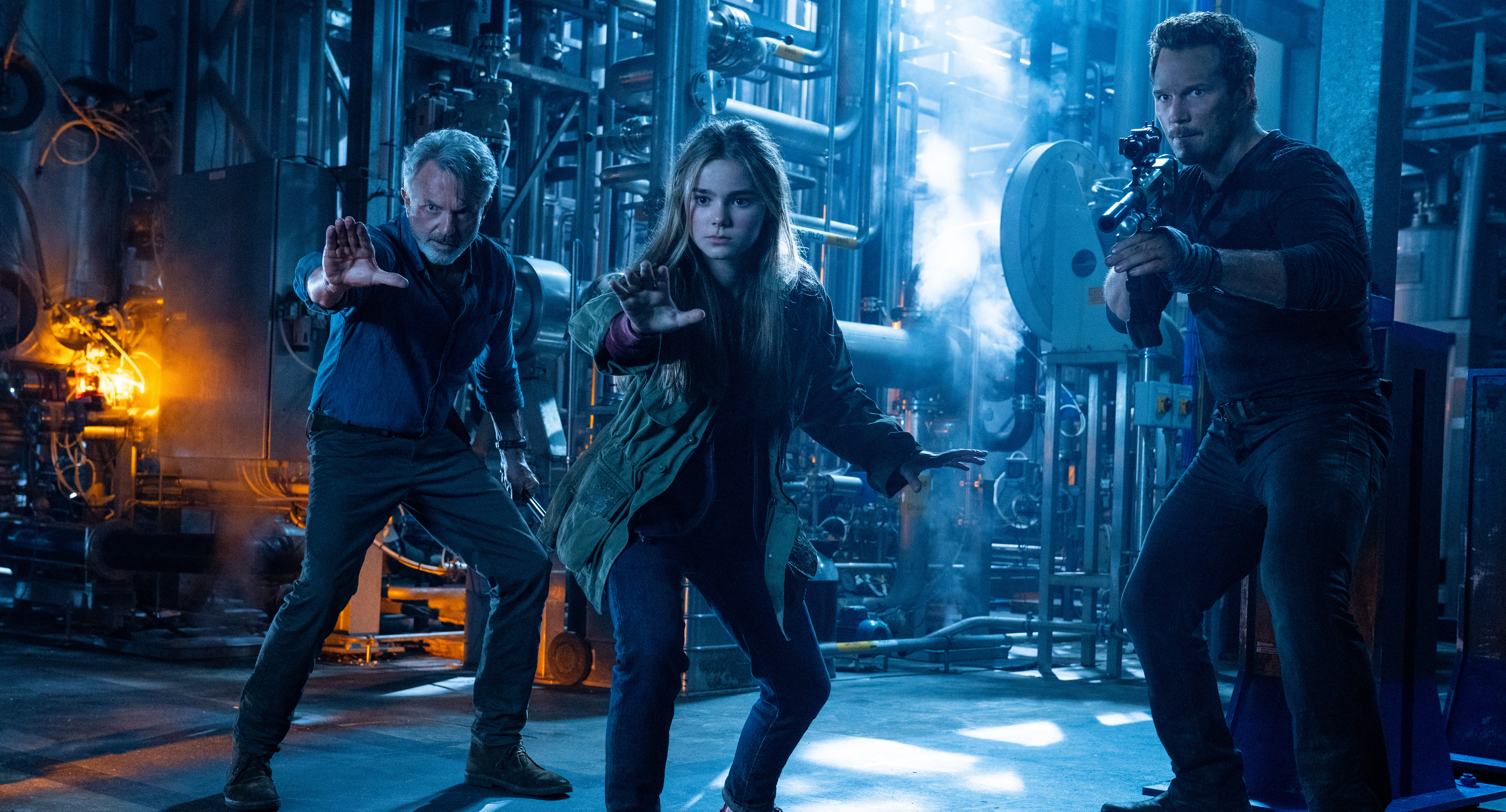 The second ‘group’ consists of Owen (Chris Pratt), who’s still a bit of a ‘cowboy’ and is living off-the-grid in the woods with his girlfriend Claire (Bryce Dallas Howard) and their ‘adopted’ child, Maisie Lockwood (Isabella Sermon) — remember that genetic clone of Sir Benjamin Lockwood’s dead daughter we met in 2018’s Jurassic World: Fallen Kingdom? They’re trying to keep the kid safe from the outside world, seeing as Owen and Claire are afraid that she’ll be taken away and experimented on if she’s found. Alas, Maisie is eventually kidnapped by poachers, along with velociraptor Blue’s baby, Beta, causing Owen and Claire to go on a mission to rescue and retrieve them. Unsurprisingly, it leads them all to Biosyn’s dino-filled research facility in the Dolomites, where the OG crew meets the new, and everything that can go wrong does because … well, this is a Jurassic film, after all.