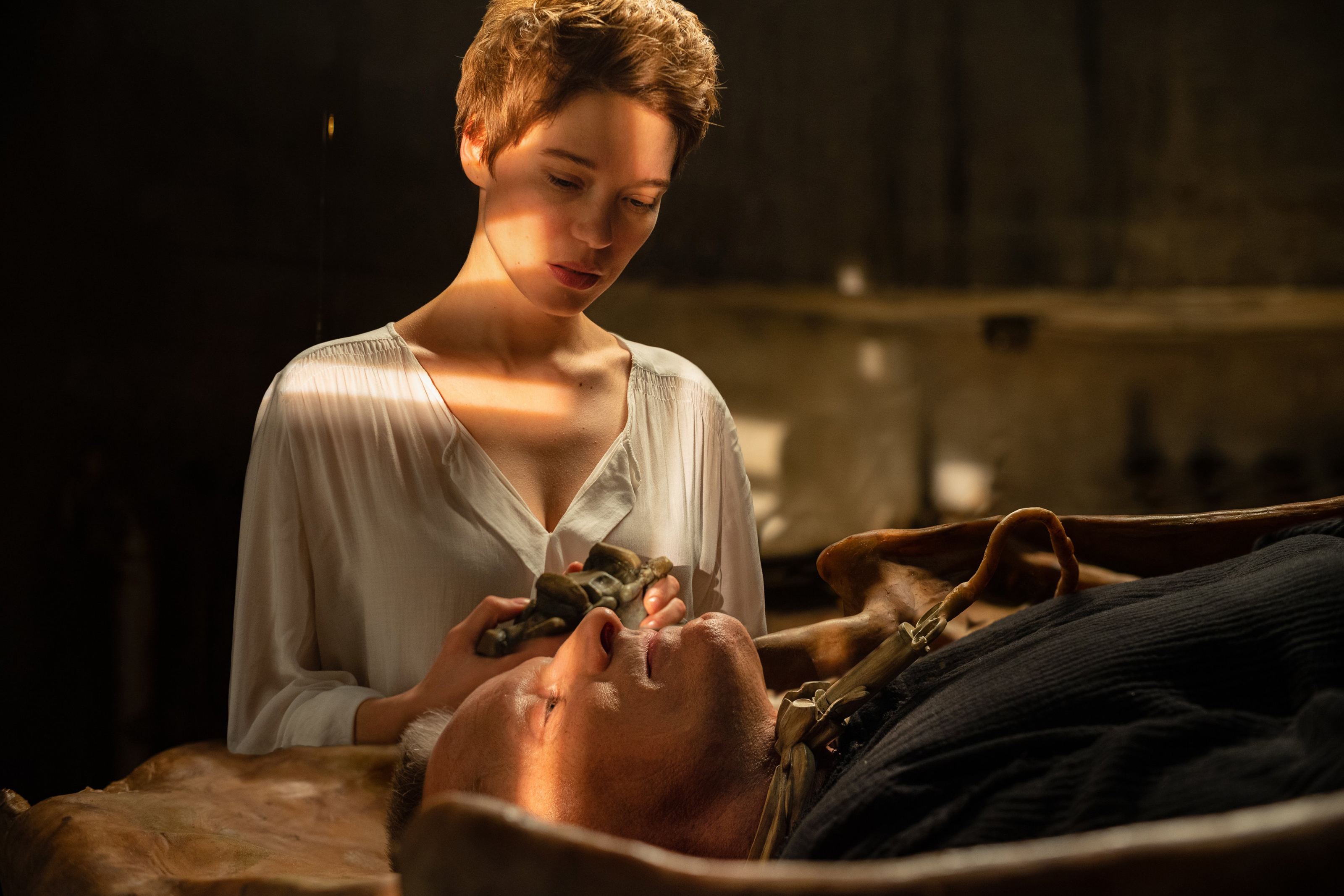 Elsewhere we are introduced to the central players in the drama. Saul Tenser (played by Viggo Mortensen, who at this stage could be rightly called Cronenberg’s muse) and his assistant Caprice (Léa Seydoux) inhabit a retro-futurist space where Caprice (a former trauma surgeon) cares for Saul, whose body spontaneously creates new and surplus organs that do not exist for any practical biological reason. What the organs do supply is a way for Tenser and Caprice to gain celebrity as the surgery involved in the removal of the organs is made into performance art.