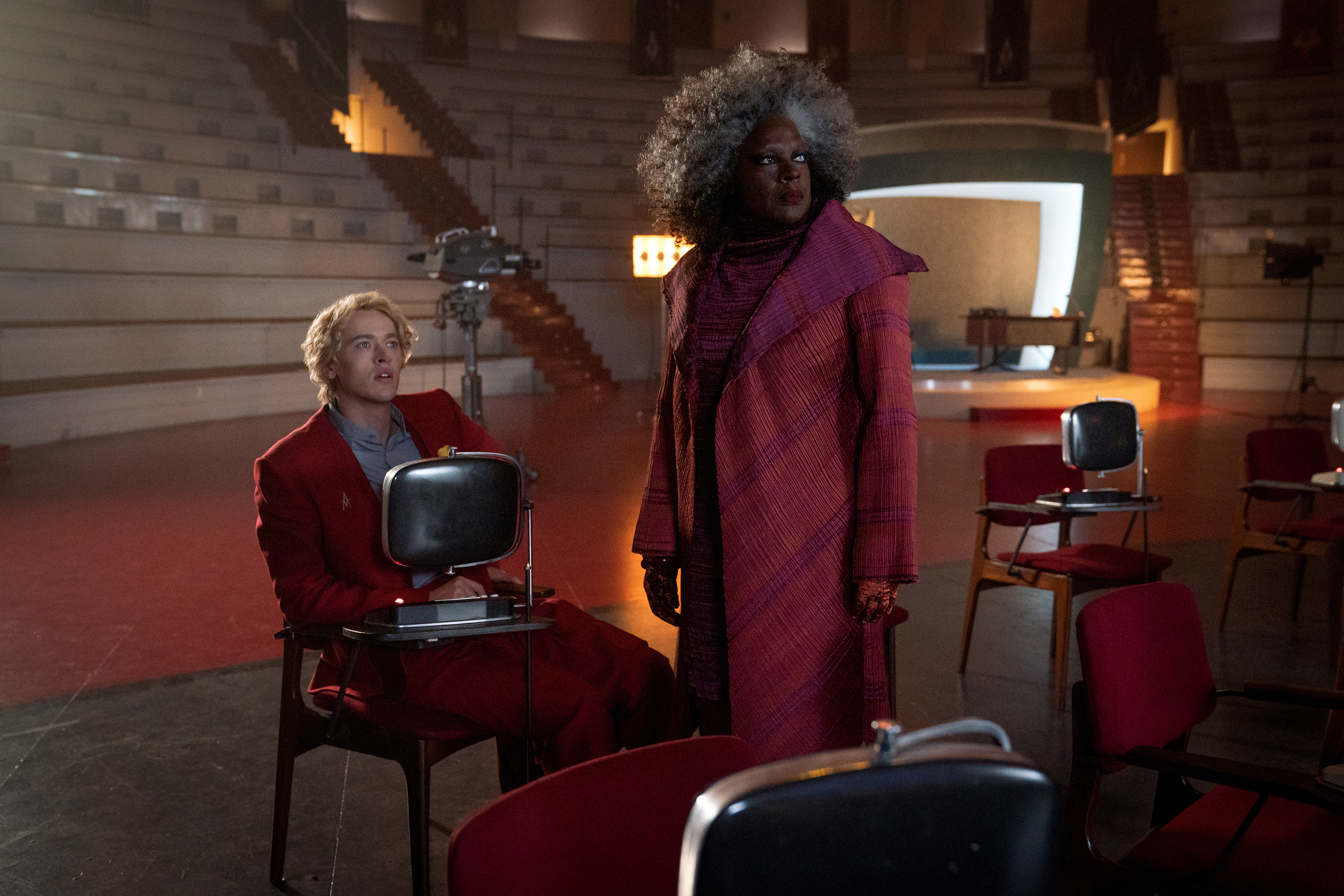 We have more fun with Viola Davis as the wonderfully-monikered Dr. Volumnia Gaul, a big-haired mad scientist who cooks up all the weird and deadly critters that populate the world of The Hunger Games. Davis understands that Too Big isn’t Big Enough here and chews the scenery appropriately. So too does Jason Schwartzman as Lucretius “Lucky” Flickerman, TV host and close-up magician, and presumed ancestor to Stanley Tucci’s Caesar Flickerman. Where Tucci was jaded, Schwartzman is desperate, aware that even in the most fraught times, a good court jester tends to get fed. Burn Gorman shows up later as Commander Hoff, Coriolanus’s commander after he gets sent off to be a Peacekeeper when his machinations get him in trouble, and it’s always good to see Burn Gorman. Fionnula Flanagan as Coriolanus’s grandmother and Hunter Schafer as his cousin, Tigris, the manifestations of the family he’s determined to protect and raise up? They’re fine, although it’s hard to muster much sympathy for people whose main problems could be solved by moving to a smaller apartment (surely there’d be plenty spare — the Capitol real estate market makes less sense than Sydney’s).